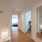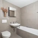 De är inredda med parkettgolv. Badkar och dusch finns här.